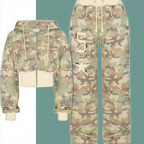 Conjuntos femininos Applique Pulôver Bordado Camisola Zipper Hoodie Camuflagem Moletom Casual 2 Peças Terno de Curto Comprimento Tops